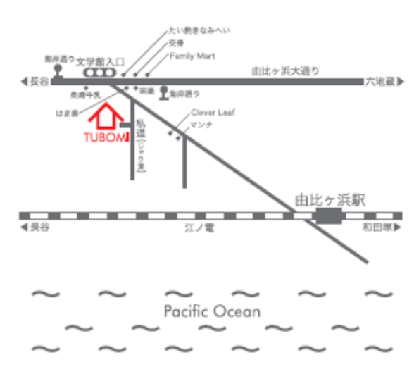 由比ガ浜大通りを文学館入り口の信号で由比ヶ浜駅のほうに入った路地からすぐ。由比ガ浜駅からは徒歩2分です。