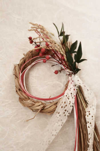 厄を食い止めるといわれるしめ縄、神の依代(よりしろ)の松、五穀豊穣の稲、その他水引や和紙、木の実などもあしらって、オリジナルの輪飾りをつくります。